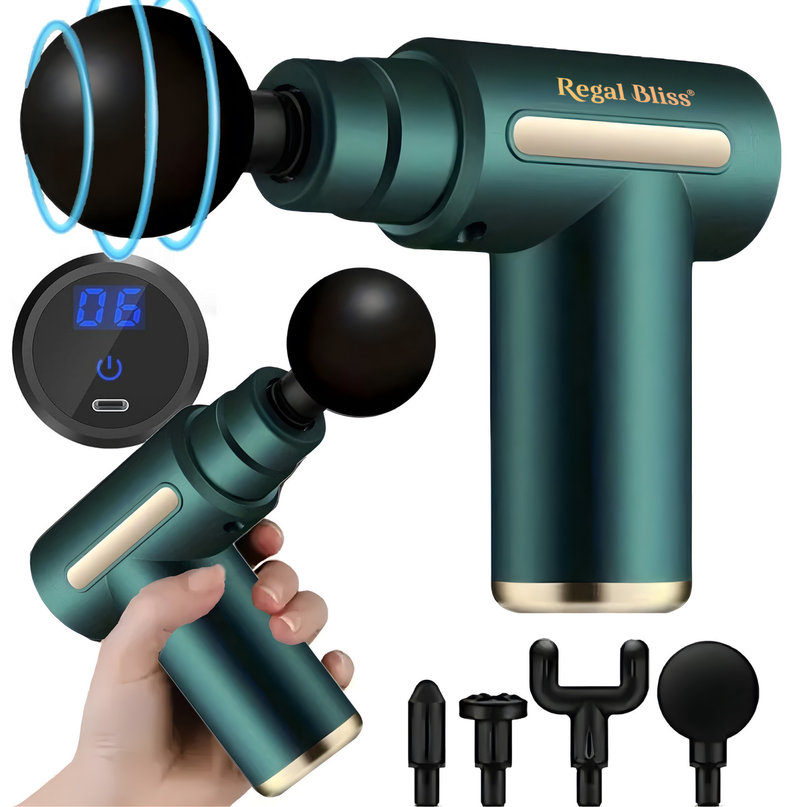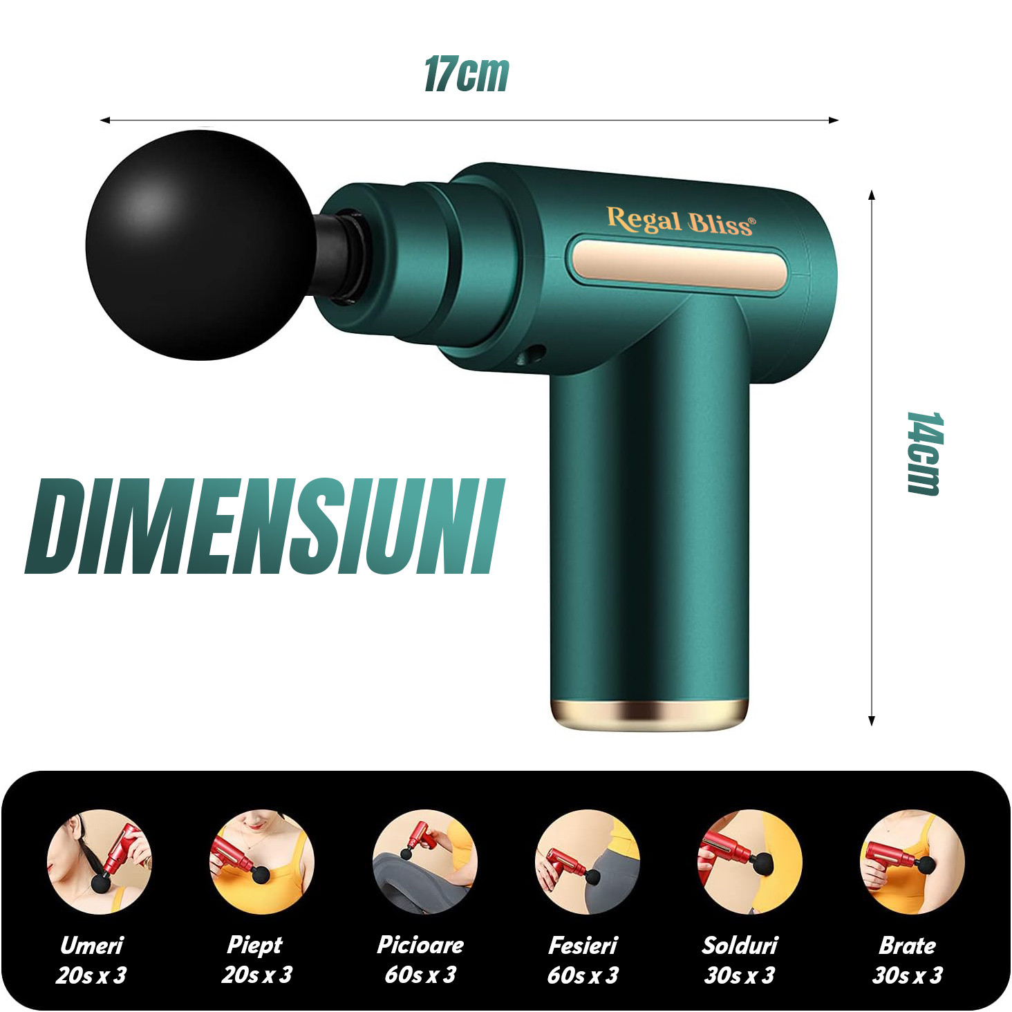 Aparat pentru masaj profesional Regal Bliss® – pistol de masaj anticelulitic, relaxare musculara, ultra-silentios, 6 trepte de viteza, autonomie pana la 8 ore, ecran LCD, 4 capete interschimbabile, baterie 1200mAh