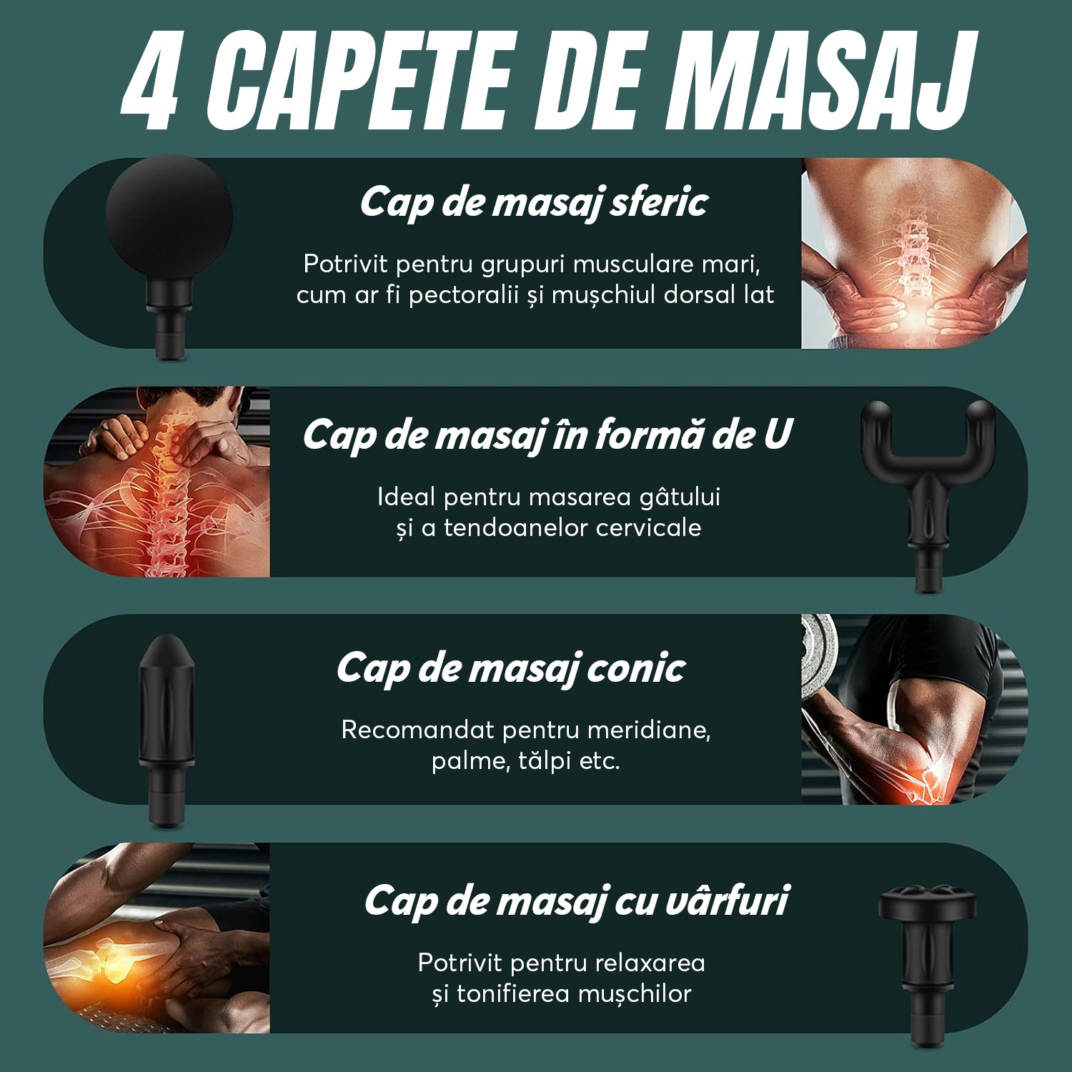 Dotat cu ecran LCD modern, aparatul afiseaza nivelul de viteza si nivelul bateriei, pentru un control precis al sesiunii de masaj. Cele 4 capete de masaj interschimbabile (sferic, conic, in forma de U si cu varfuri) sunt special concepute pentru zone diferite: umeri, spate, picioare, brate, abdomen, solduri si muschii profunzi.