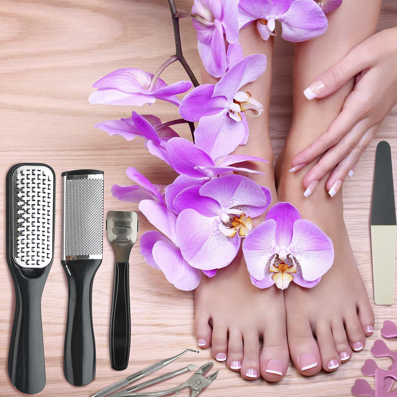 Acest set complet de 26 de accesorii pentru pedichiura ofera o solutie pentru toate nevoile tale de ingrijire a picioarelor. Creat pentru a elimina eficient bataturile, pielea uscata si calusurile, setul te ajuta sa obtii picioare catifelate si sanatoase fara a apela la servicii profesionale. Este ideal atat pentru uz casnic, cat si pentru profesionisti.