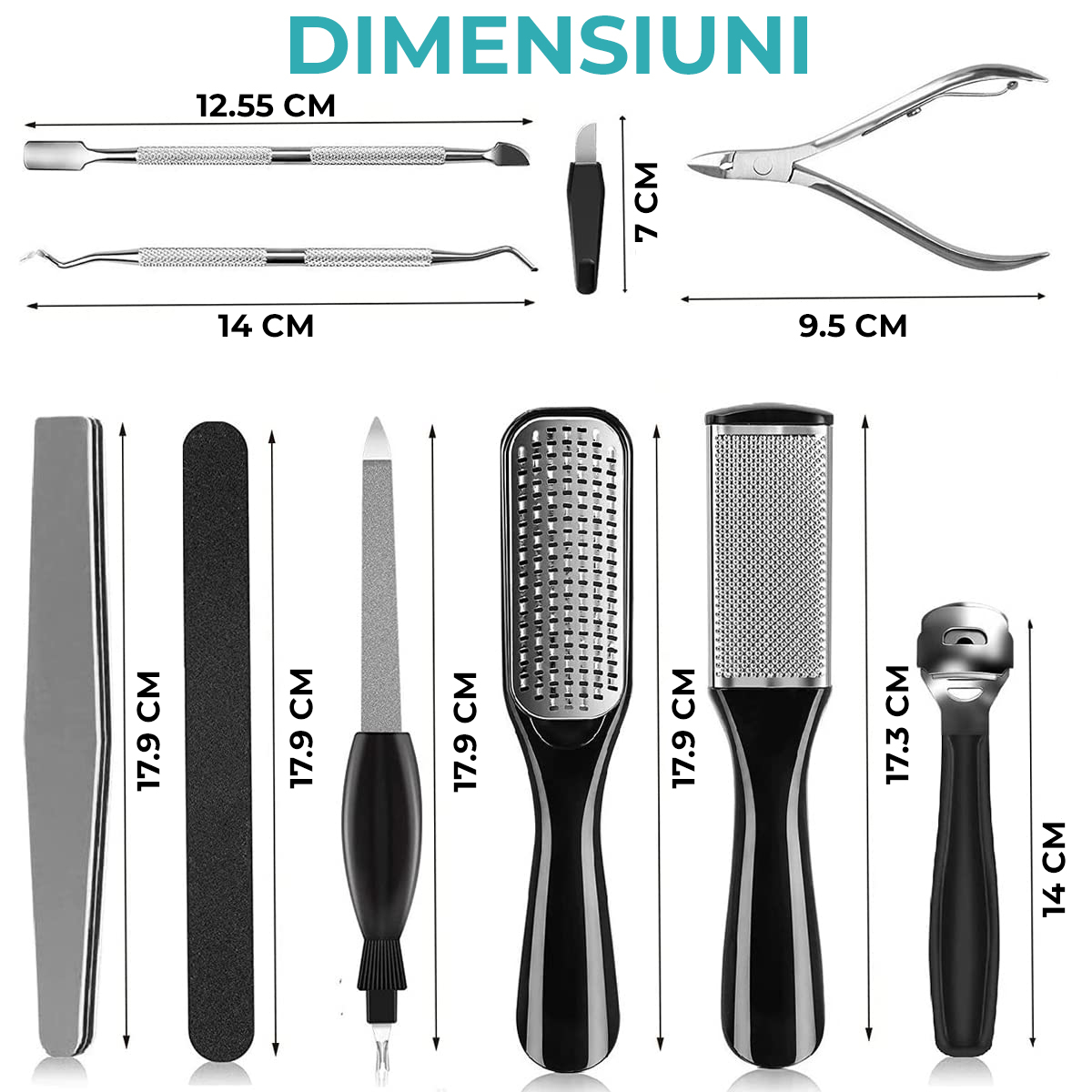Instrumente profesionale pentru pedichiura medicala, ideale in inghrijirea picioarelor si indepartarea eficienta a calusurilor, material durabil din otel inoxidabil, Set complet de 26 accesorii, Regal Bliss ®