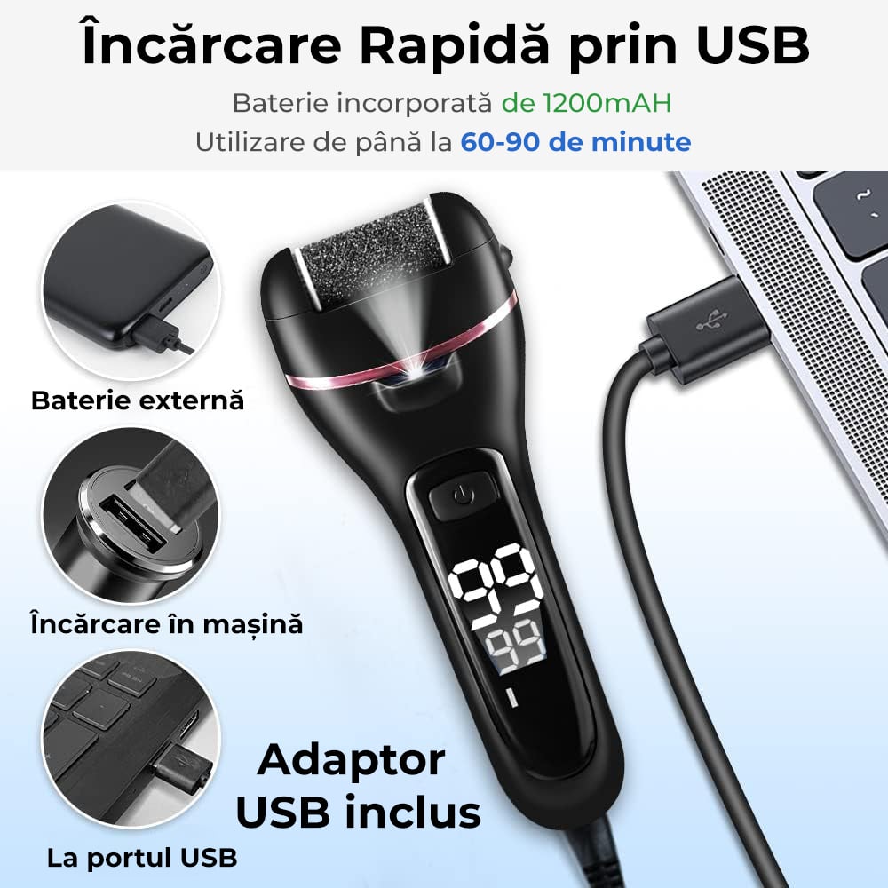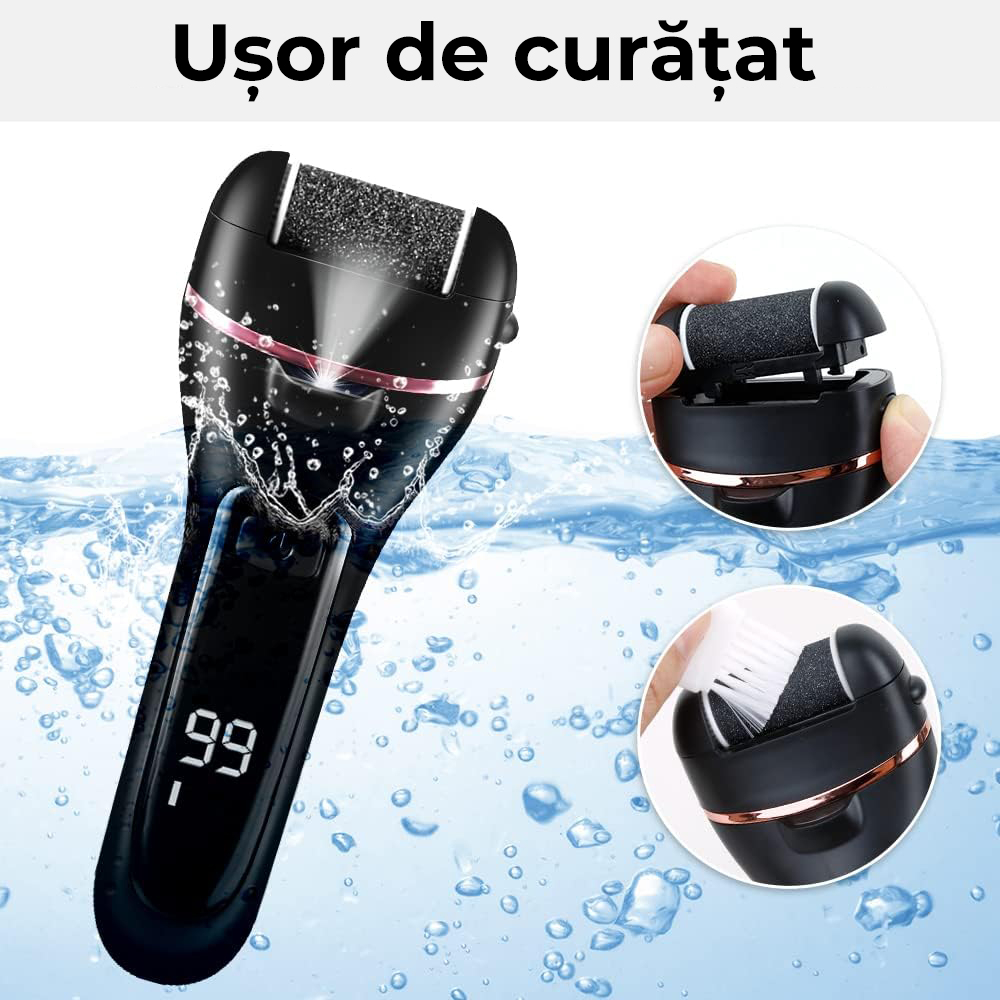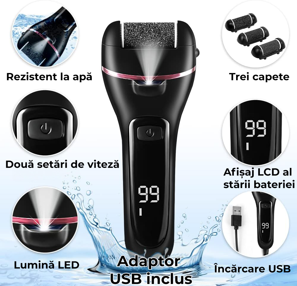 Pila electrica pentru picioare cu indepartare eficienta a calusurilor, rezistent la apa, pentru calcaie crapate si piele uscata, ideal in pedichiura medicala, baterie durabila, ecran LCD, Set cu accesorii incluse, Negru, Regal Bliss ®