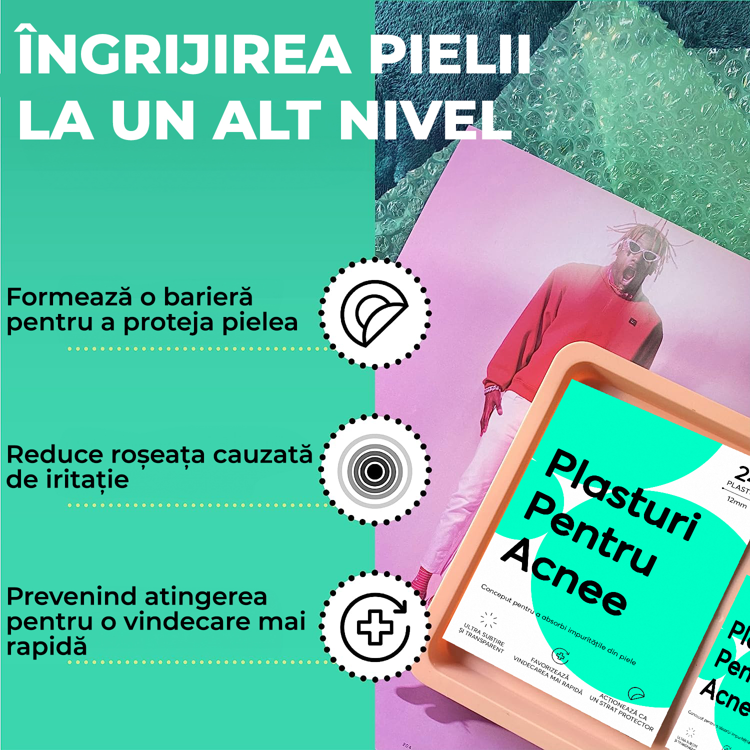 Acesti plasturi servesc nu doar ca o bariera protectoare care previne atingerea sau iritarea acneei, dar si ca un mijloc eficient de a reduce roseata si inflamatia, fara a interfera cu activitatile zilnice.