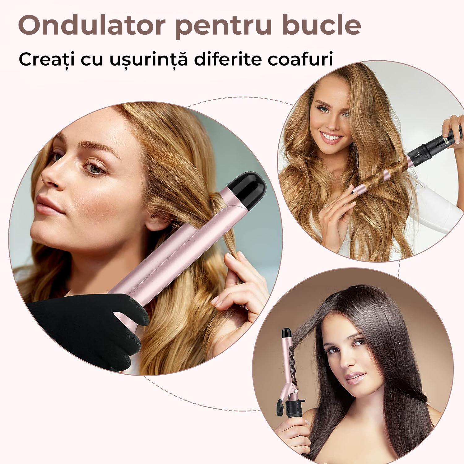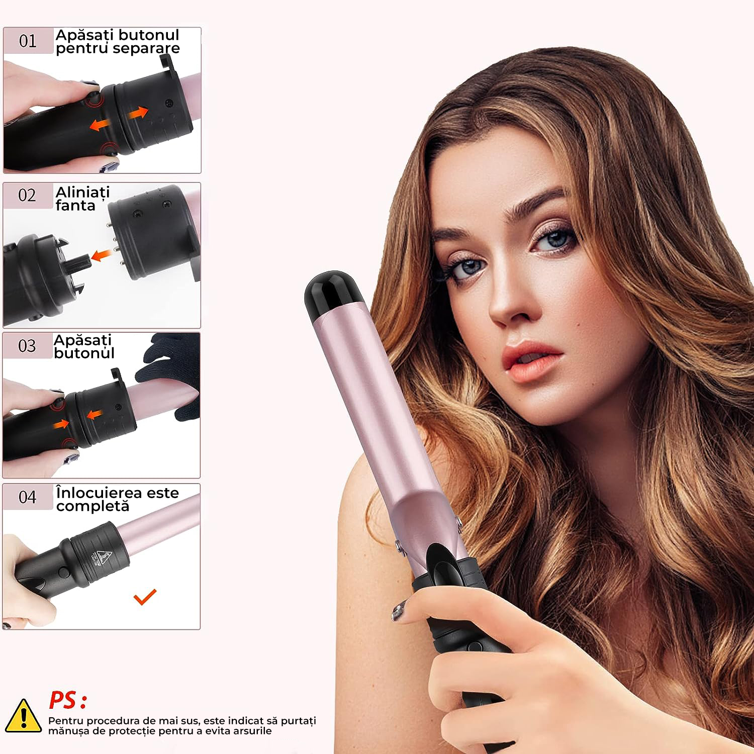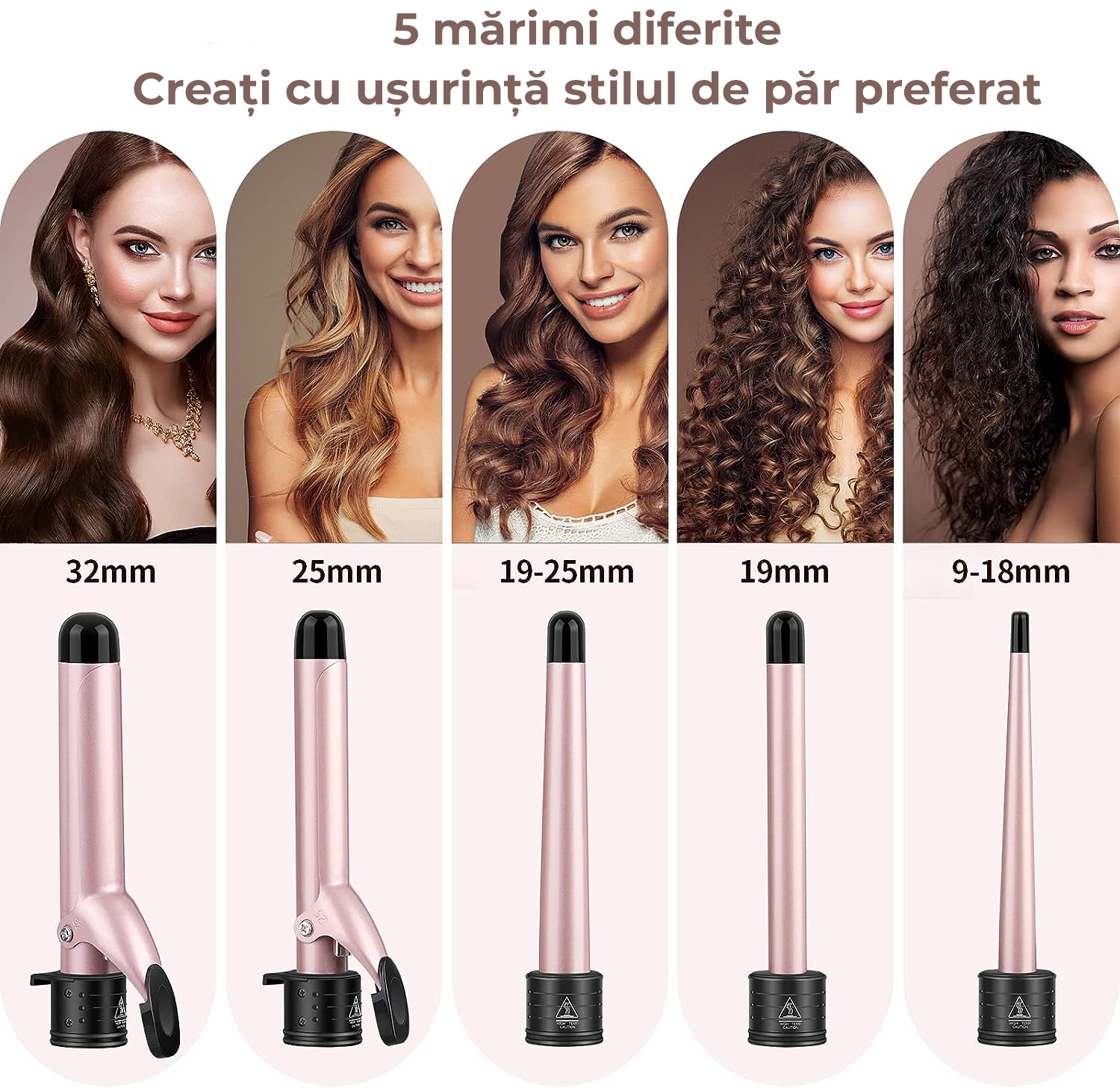 Acest set cuprinde 5 capete interschimbabile, fiecare cu dimensiuni diferite (9mm, 9-18mm, 18-25mm, 19mm, 25mm, 32mm), astfel incat sa poti experimenta cu diferite stiluri si texturi. Indiferent daca ai par lung sau scurt, acest set iti ofera posibilitatea de a-ti exprima creativitatea in ce priveste coafura.