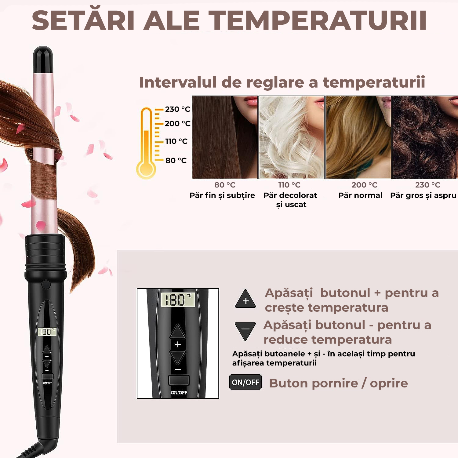 O caracteristica cheie a acestui set este reglarea temperaturii, care variaza intre 80°C si 230°C . Ecranul LCD afiseaza cu claritate temperatura selectata, astfel incat sa poti ajusta cu usurinta caldura in functie de tipul tau de par. Ondularea parului devine astfel mai precisa si mai personalizata, asigurandu-ti ca rezultatele finale sunt pe gustul tau.