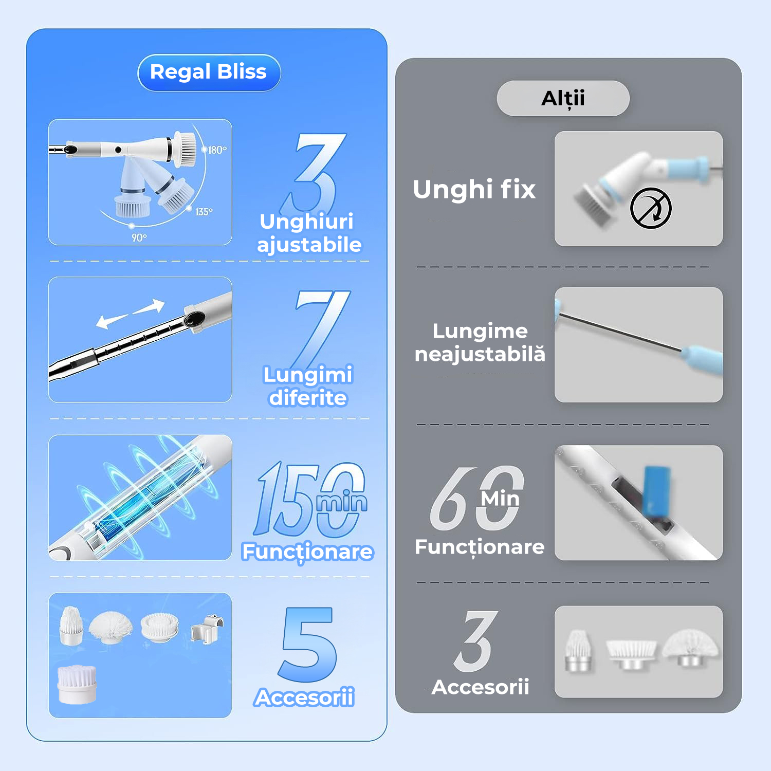 Regal Bliss Perie electrica rotativa pentru curatare Regal Bliss ®, maner extensibil, baterie reincarcabila si functionalitate fara fir pana la 2h, cu 4 capete detasabile, 380 Rotatii pe Minut