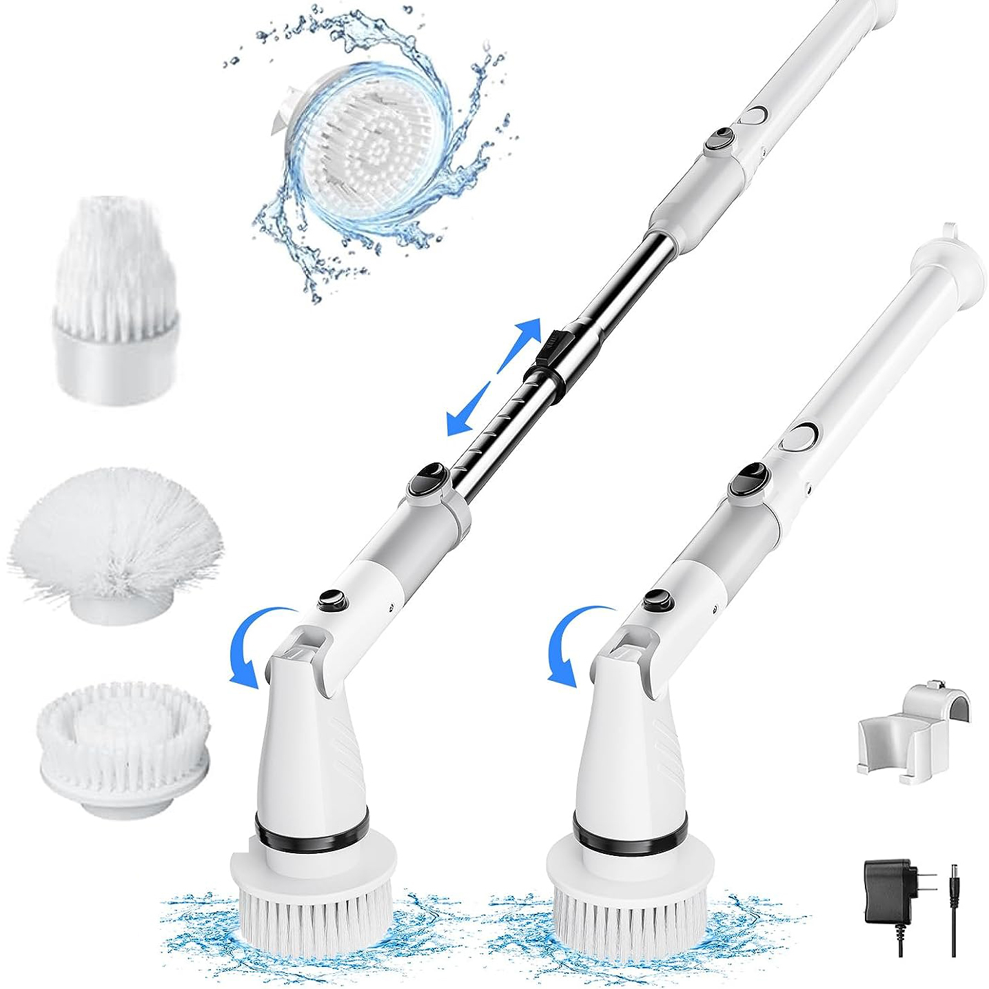 Perie electrica rotativa pentru curatare eficienta fara efort, maner extensibil, baterie reincarcabila si functionalitate fara fir pana la 2h, pentru diverse suprafete, cu 4 capete detasabile, 380 Rotatii pe Minut, Alb cu Gri, Regal Bliss ®