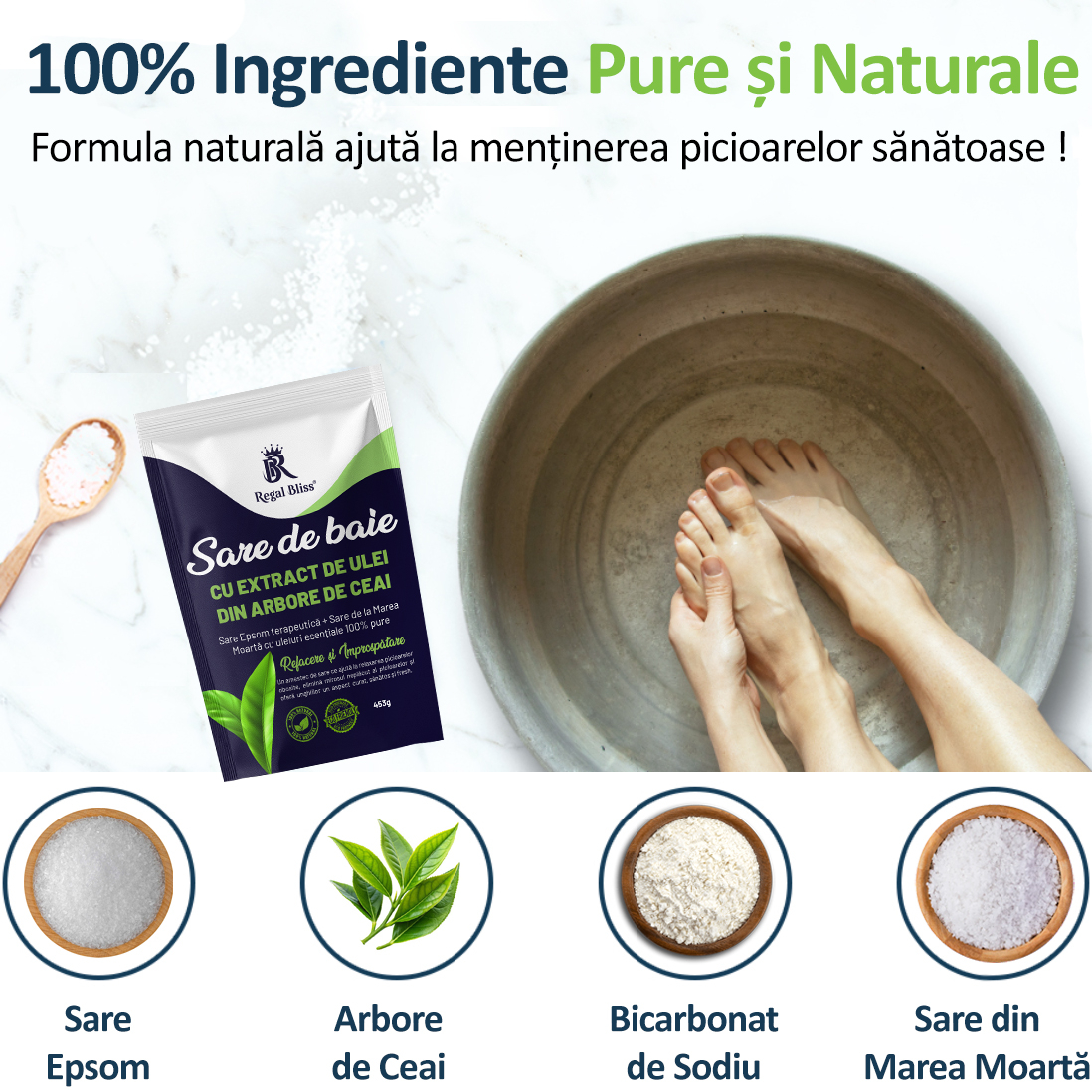 Sare de baie, cu extract de ulei esential din arbore de ceai si sare Epsom terapeutica, relaxeaza picioarele dureroare si obosite, si inmoaie calusurile aspre, tratament 100% natural pentru unghii si piele, 453g, 1 Buc, Regal Bliss ®