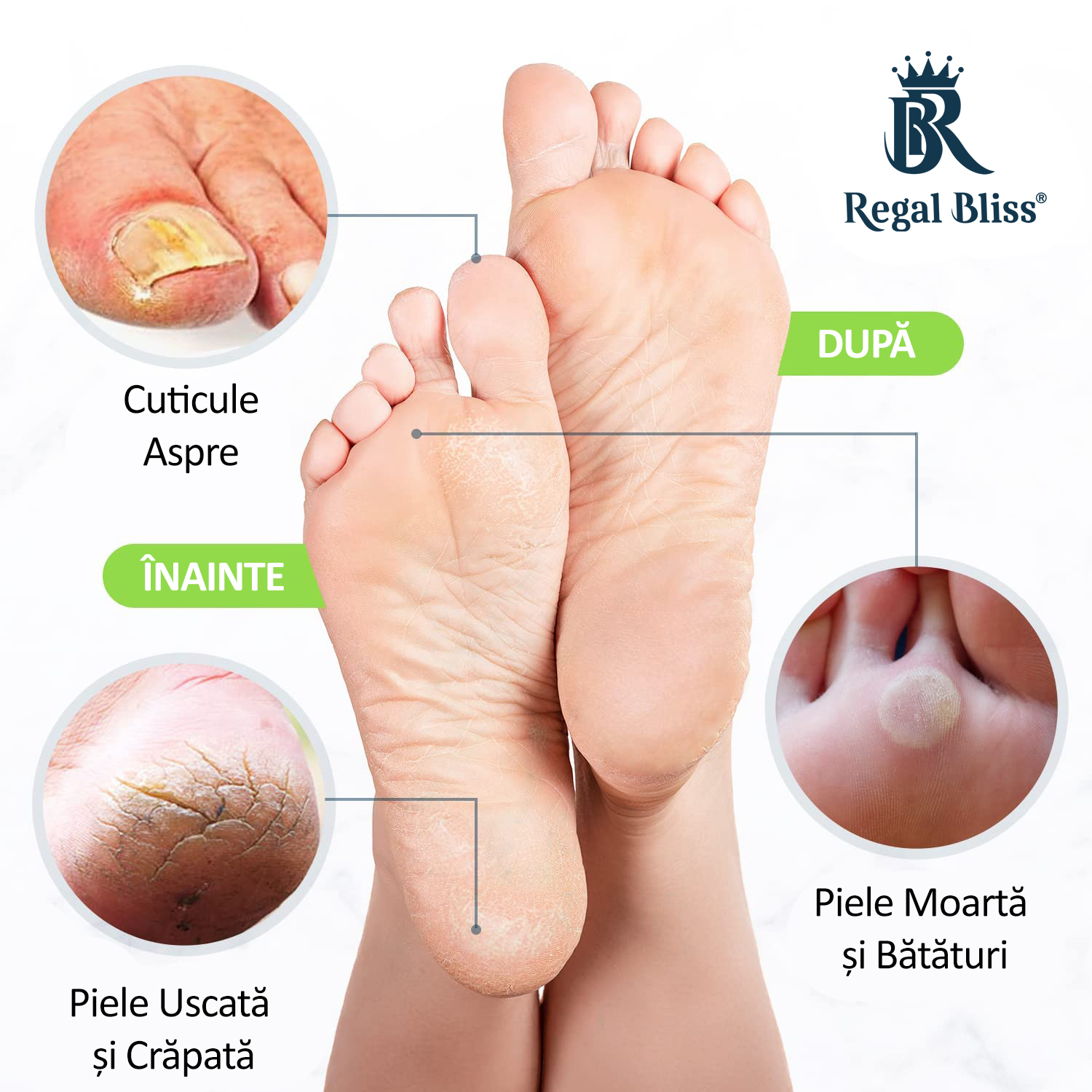 - Inmuiere si exfoliere: Indeparteaza bataturile si calusurile aspre, lasand pielea moale si fina.